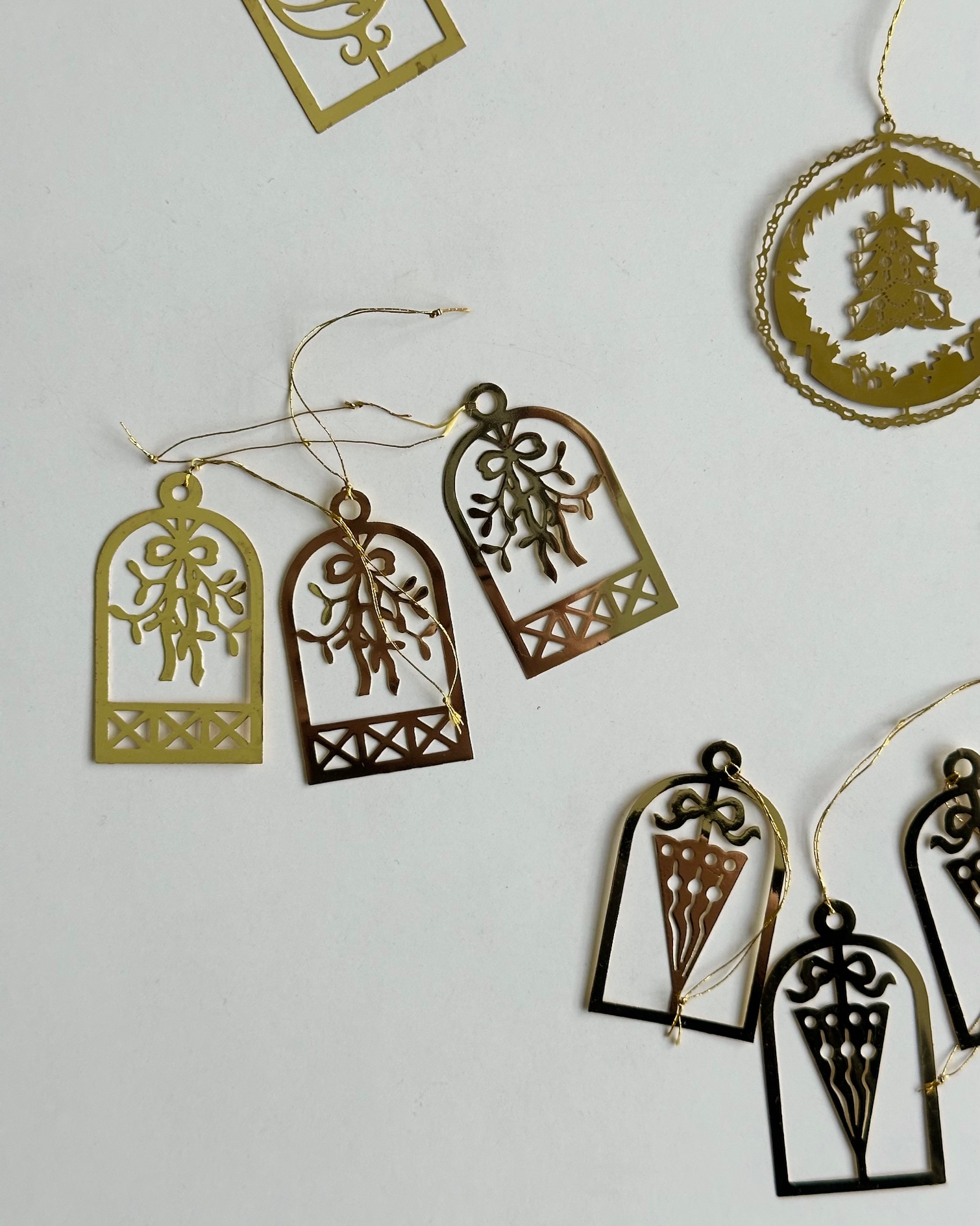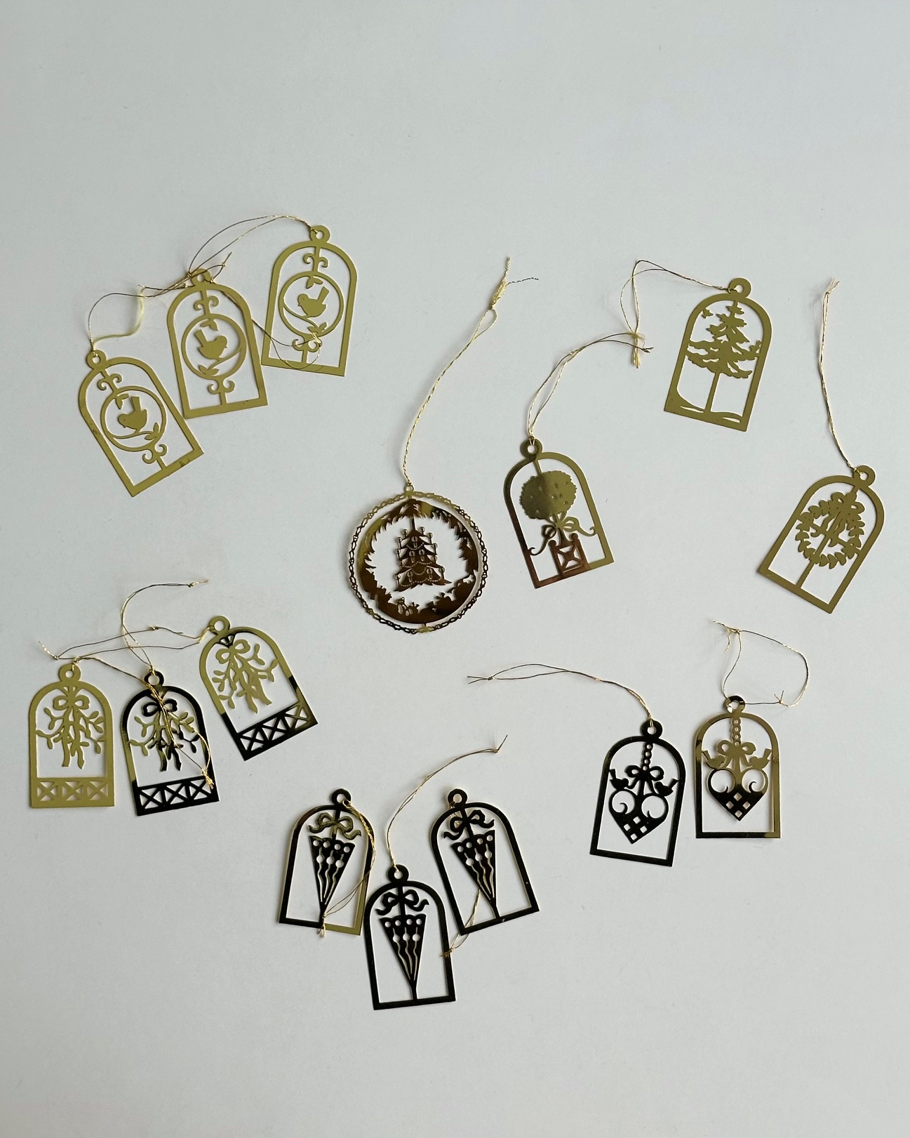 Ornaments, golden metal, set of 15