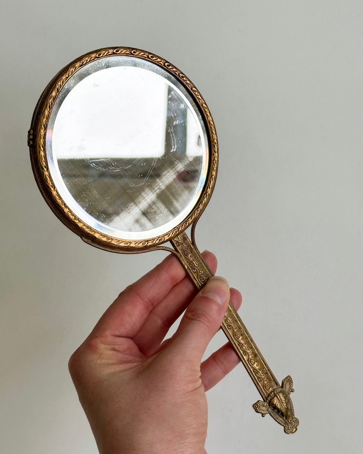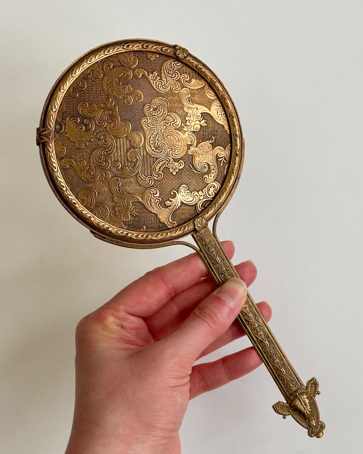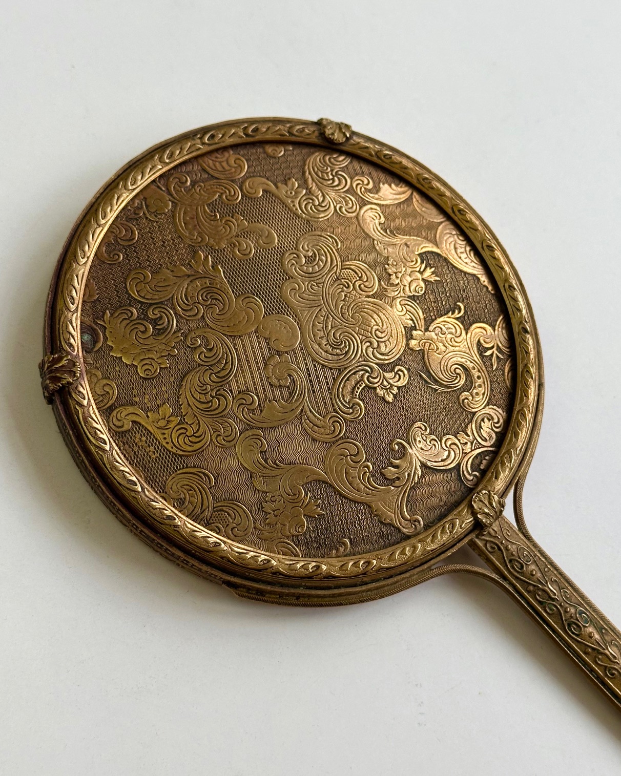 Beautiful handheld mirror of golden metal, maybe brass, with fantastic ornamentation and facetted mirror